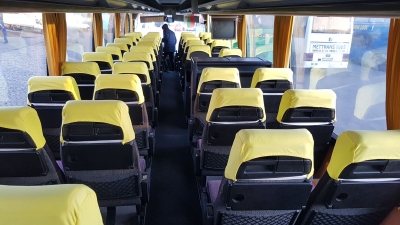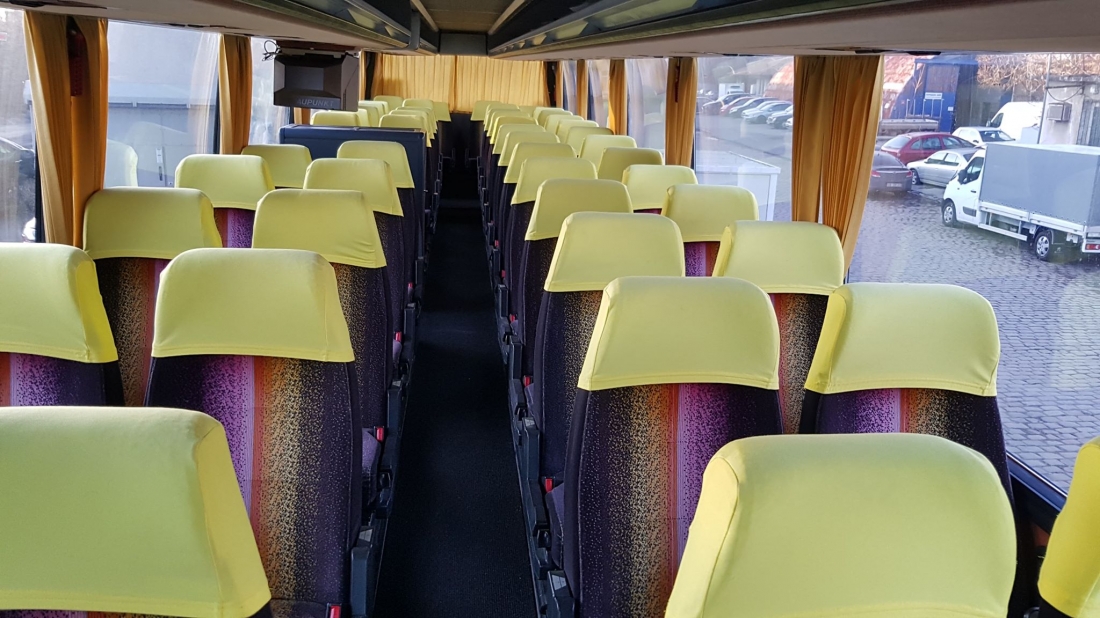 ✔Автобусът е оборудван с комфортни седалки. Има степенки за краката и масички пред всяка седалка.